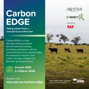 The Carbon EDGE Bursary is an opportunity for one Future Farmers Network member to build capability in farm carbon and sustainability planning by attending a Carbon EDGE program—developed by Meat & Livestock Australia to help livestock businesses understand emissions and carbon storage options and create a practical action plan using their own farm information.